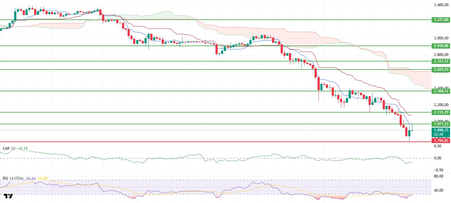 ETH experienced a sharp pullback yesterday evening as selling pressure increased, reaching the critical support level of $1,756. Buying activity from this region slowed the decline somewhat, and the price briefly rebounded toward the $1,971 resistance zone. However, this rally was not sustainable, and the price retreated back to the $1,900 region amid selling pressure from the resistance. The structure that formed at the end of the day shows that buyers occasionally stepped en at the bottom levels but are not yet strong enough to turn the market upward. In the short term, the price is still trading el fragile ground.