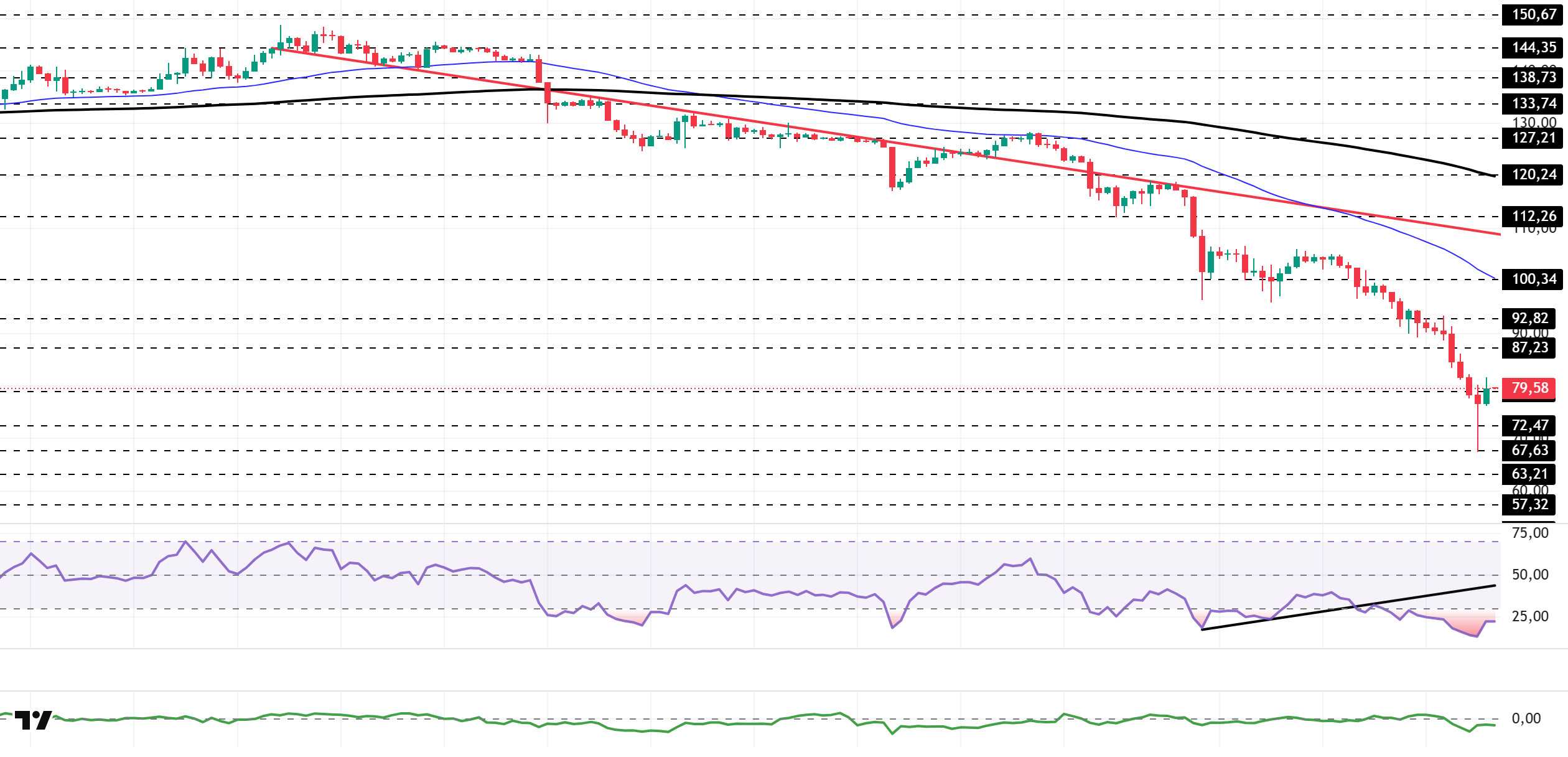 The SOL price fell to its lowest level since December 18, 2023, dropping to $67.63. The asset remained en the lower region of the downward trend that began el January 13, signaling continued selling pressure. The price found support at the strong support level of $67.63 and gained momentum from there, rising. If the rise continues, the $87.23 level could act as resistance. If the pullback resumes, the $63.21 level should be monitored.