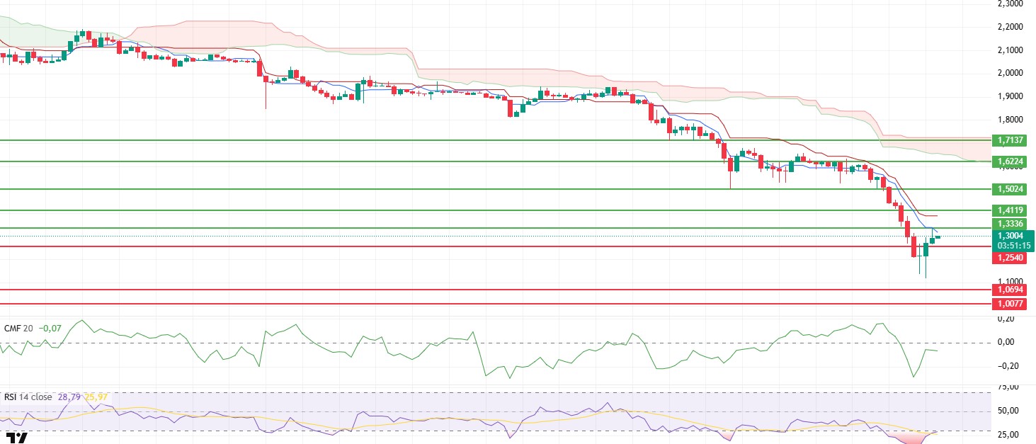 The XRP price lost its $1.25 support level yesterday evening and fell sharply to around $1.11. Buying activity from this area slowed the decline somewhat, and the price rebounded towards the $1.33 resistance zone. However, this rebound was not sustained, and the price fell back to around $1.28 amid selling pressure from the $1.33 zone. The structure formed at the end of the day indicates that panic selling has slowed down, but buyers have not yet established strong control. In the short term, the price is still trading el fragile ground.