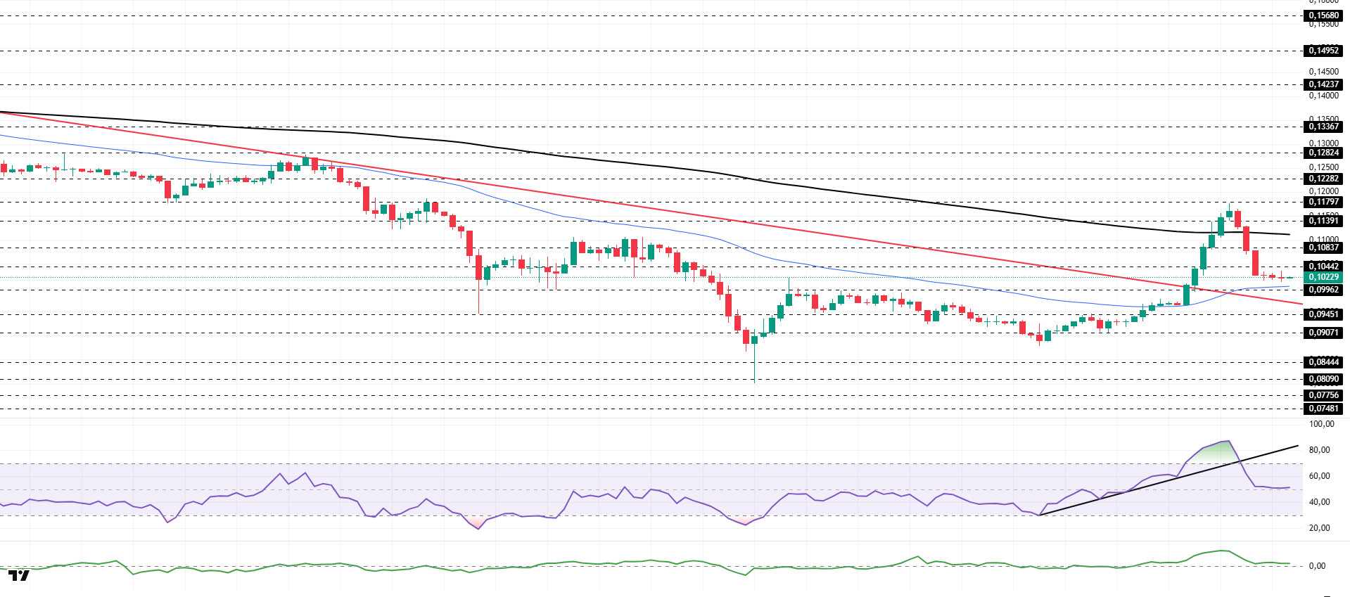 El precio de DOGE experimentó un ligero retroceso después del rally.El activo se movió hacia la región superior de la tendencia bajista que comenzó el 14 de enero y logró mantenerse allí. El precio, que retrocedió del fuerte nivel de resistencia de $0.11797, continuó su descenso al romper por debajo de la media móvil de 200 EMA (Línea Negra). Actualmente, al probar la media móvil de 50 EMA (Línea Azul) como soporte, el activo puede poner a prueba la tendencia bajista como soporte en los cierres de velas por debajo de la media móvil de 50 EMA. Si sube desde aquí, la media móvil de 200 EMA puede actuar como resistencia.En el gráfico de 4 horas, la EMA de 50 (Media Móvil Exponencial - Línea Azul) se mantuvo por debajo de la EMA de 200 (Línea Negra). Esto indica una tendencia bajista a medio plazo. El precio, al estar entre las dos medias móviles, sugiere que el precio se encuentra en una fase de decisión a corto plazo. El Chaikin Money Flow (CMF-20) está en territorio positivo. Además, el aumento en los flujos de dinero puede mantener el CMF en territorio positivo.El Índice de Fuerza Relativa (RSI-14) se ha retirado de la zona de sobrecompra a niveles neutrales. Al mismo tiempo, cruzó por debajo de la línea ascendente que comenzó el 11 de febrero, señalando que la presión de venta podría estar aumentando.En caso de una tendencia alcista impulsada por desarrollos políticos, datos macroeconómicos o un flujo de noticias positivas en el ecosistema de DOGE, el nivel de $0.11797 se destaca como una fuerte zona de resistencia. Por el contrario, en caso de un flujo de noticias negativas, el nivel de $0.08090 podría ser activado. Una caída a estos niveles podría aumentar el impulso e iniciar una nueva ola de crecimiento.Soportes:0.09962 – 0.09451 – 0.09071Resistencias: 0.10442 - 0.10837 - 0.11391