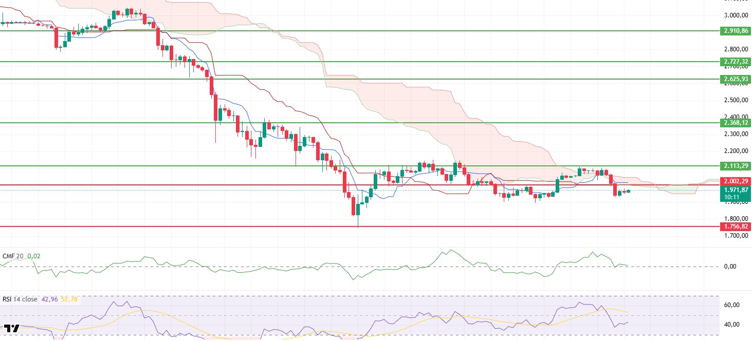 El precio de ETH continuó subiendo a medida que se acercaba el fin de semana, alcanzando los $2,105 el sábado. Sin embargo, este movimiento no fue sostenible. Junto con una caída de aproximadamente $500 millones en el interés abierto, el cierre de posiciones largas desencadenó presión de venta, y el precio retrocedió bruscamente, volviendo a la región de $1,960. La estructura actual muestra que los intentos de subida aún no han encontrado un terreno sólido y que la fragilidad persiste en el mercado. La debilidad en la liquidez se ha hecho evidente nuevamente. El indicador Chaikin Money Flow (CMF) retrocediendo a la línea cero señala un debilitamiento del apetito de compra y una nueva aceleración en las salidas del mercado. Esta perspectiva sugiere que los intentos de subida pueden carecer de soporte en el spot y que los movimientos ascendentes pueden tener dificultades para ganar tracción. El Índice de Fuerza Relativa (RSI) ha retrocedido al nivel 37 y está cotizando lateralmente en esta región. La persistencia del indicador en la zona débil revela que el impulso está perdiendo fuerza y que los compradores aún no han recuperado el control. A menos que haya una recuperación clara en el RSI, los ataques al alza son más propensos a seguir siendo limitados. La perspectiva general en el indicador Ichimoku no ha cambiado, y la estructura débil permanece. Mientras el precio continúa cotizando por debajo de la nube kumo, los niveles Tenkan y Kijun no han sido recuperados de manera fuerte. Este posicionamiento confirma que la tendencia principal sigue siendo a la baja y mantiene vivo el riesgo de que los niveles de resistencia obstaculicen los intentos de subida.En la evaluación general, el nivel de $2,000 sigue siendo una fuerte zona de resistencia a corto plazo. Mientras esta área no sea superada, se espera que la presión de venta continúe, y se espera que el precio busque nuevamente áreas a la baja. En la parte inferior, el nivel de $1,756 mantiene su posición principal de soporte, y posibles retrocesos hacia esta área no serían sorprendentes desde una perspectiva técnica. Soportes:1,756 - 1,539 - 1,290Resistencias:2,002 - 2,113 - 2,368