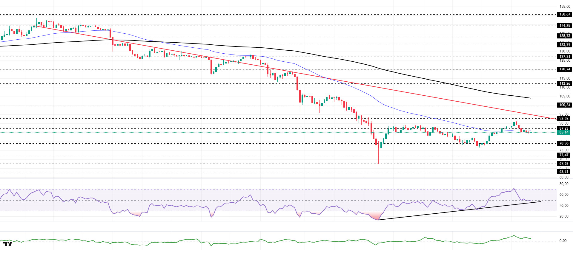 El precio de SOL experimentó un retroceso. El activo permaneció por debajo de la tendencia a la baja que comenzó el 13 de enero, señalando una presión de venta continua. Al probar el fuerte nivel de soporte de $87.23 y la media móvil de 50 EMA (Línea Azul) como soporte, el precio rompió por debajo de estos niveles, señalando un aumento en la presión de venta. Actualmente, al probar la media móvil de 50 EMA como resistencia, el activo debe ser monitoreado en el nivel de $78.69 si el retroceso continúa. Si experimenta una tendencia alcista, la tendencia a la baja podría actuar como resistencia.En el gráfico de 4 horas, el 50 EMA (Media Móvil Exponencial - Línea Azul) continúa por debajo del 200 EMA (Línea Negra). Esto indica que la tendencia a la baja sigue en el medio plazo. Al mismo tiempo, el precio por debajo de ambas medias móviles muestra que el activo está en tendencia a la baja en el corto plazo. El Chaikin Money Flow (CMF-20) ha pasado a territorio positivo. Sin embargo, un aumento en las salidas de dinero podría llevar al CMF a territorio negativo.El Índice de Fuerza Relativa (RSI-14) se ha retirado de la zona de sobrecompra a niveles neutrales. Al mismo tiempo, se está preparando para probar la tendencia alcista que comenzó el 6 de febrero como soporte. Una ruptura a la baja podría aumentar la presión de venta.Si hay una tendencia alcista debido a datos macroeconómicos o noticias positivas relacionadas con el ecosistema de Solana, el nivel de $100.34 se destaca como un fuerte punto de resistencia. Si este nivel se rompe al alza, se espera que la tendencia alcista continúe. En caso de retrocesos debido a desarrollos en la dirección opuesta o toma de ganancias, podría probar el nivel de $67.63. Una caída a estos niveles de soporte podría aumentar el impulso de compra, presentando una oportunidad potencial al alza.Soportes:78.96 - 72.47 – 67.63Resistencias:87.23 – 92.82 - 100.34
