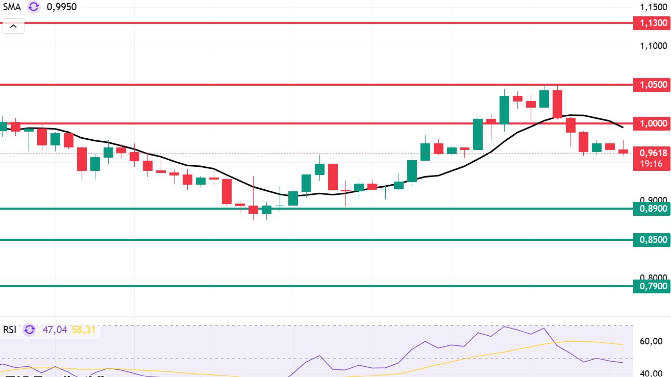 Mirando el panorama técnico de Sui,vemos que, influenciado por desarrollos fundamentales, el precio ha caído en el gráfico de 4 horasy ahora se mueve lateralmente alrededor del nivel de $0.96. El Índice de Fuerza Relativa (RSI) se encuentra actualmente en el rango de 47.04 – 58.31. Este rango indica que el mercado está operando en un punto adecuado para comprar; sin embargo, si el RSI se debilita y cae al rango de 35.00 – 40.00, podría señalar un posible punto de compra. Si el precio se mueve hacia arriba, se pueden monitorear los niveles de resistencia de $1.00, $1.05 y $1.13. Sin embargo, si el precio cae a nuevos mínimos, podría indicar que la presión de venta se está intensificando. En este caso, los niveles de $0.89 y $0.85 destacan como zonas de soporte fuertes. Basado en la línea de tendencia, un retroceso a $0.79 parece técnicamente posible. Según los datos de Promedios Móviles Simples (SMA), el precio promedio de Sui se encuentra actualmente en $0.99. Si el precio se mantiene por debajo de este nivel, podría señalar que la tendencia alcista actual puede no continuar técnicamente. La tendencia a la baja del SMA también apoya este escenario.Soportes:0.79 – 0.85 – 0.89Resistencias:1.00 – 1.05 – 1.13