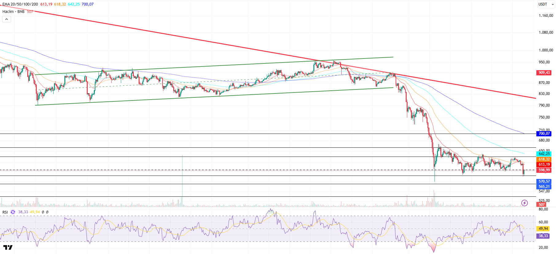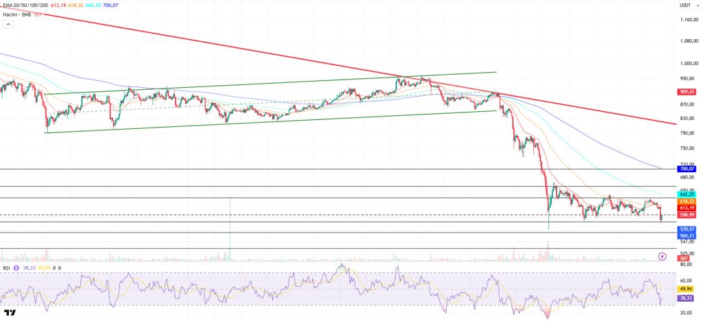 From a technical perspective, BNB, which has been strengthening its upward momentum for some time, has exceeded its previously set target levels and reached the $950 mark. However, due to the pressure it faced at these levels, it has gained downward momentum, remaining below the ongoing downward trend. In this regard, it has broken below the rising channel it was en and recorded sharp declines.
