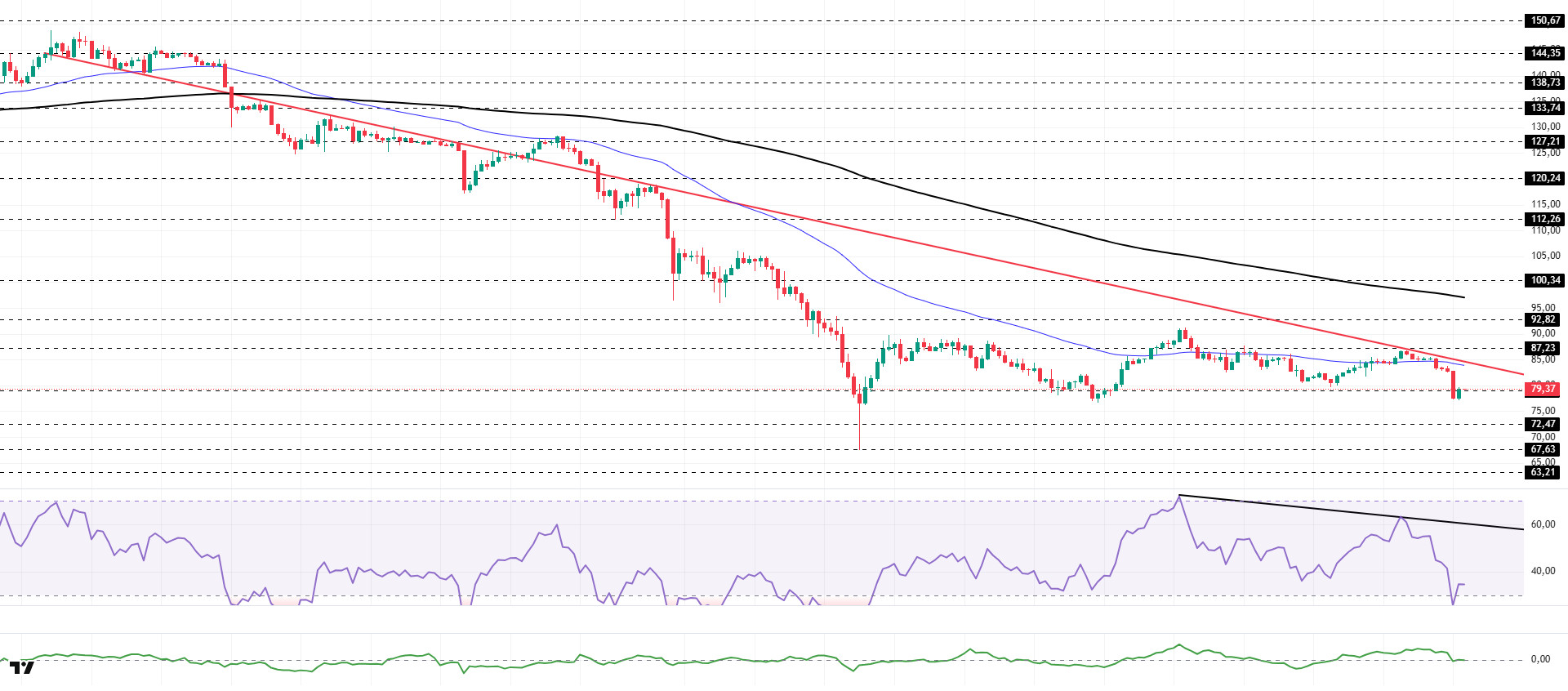 On the 4-hora chart, the 50 EMA (Exponential Moving Average – Blue Line) continues to remain below the 200 EMA (Black Line). This indicates that the downtrend is continuing en the medium term. At the same time, the asset trading below both moving averages suggests that the asset is trending downward en the short term. The Chaikin Money Flow (CMF-20) has retreated to a neutral level. However, an increase en money inflows could push the CMF into positive territory. The Relative Strength Index (RSI-14) has fallen into the oversold zone. This could trigger rebound buying driven por short covering. It also remained below the downward trend line that began el February 15. In the event of an uptrend driven por macroeconomic data or positive news related to the Solana ecosystem, the $100.34 level stands out as a strong resistance point. If this level is broken upwards, the uptrend is expected to continue. In the event of pullbacks due to developments en the opposite direction or profit-taking, it may test the $67.63 level. A decline to these support levels could increase buying momentum, presenting a potential opportunity for an upward move.