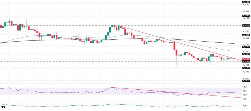 The DOGE price traded sideways during the day. The asset moved into the upper region of the downtrend that began el January 14, signaling that buying pressure could increase. Testing the strong support level of $0.12282, the price gained momentum from this level and rose, and is currently testing the downtrend as support. Above this level, the 50 EMA (Blue Line) moving average could act as resistance. In the event of a pullback, it could retest the $0.12282 level as support.
