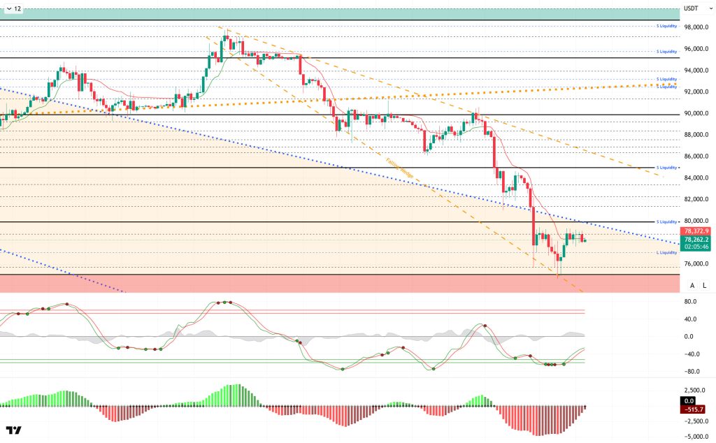From a technical perspective, BTC’s partial recovery process continues. BTC, which appeared weak during the day, formed short-bodied candles with low volatility. With the resistance it formed at the 78,800 level, the price struggled to break through this level, prolonging the consolidation process. BTC, which lacks catalysts for price movement, is experiencing increased market sensitivity. In this context, for a potential upward movement to be sharp with a sudden price jump, the 80,000 level may need to be broken first.