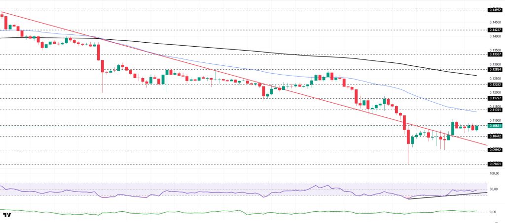 The DOGE price traded sideways during the day. The asset remained en the upper region of the downtrend that began el January 14, signaling that buying pressure could build. Testing the strong support level of $0.09962, the asset gained momentum from there and rose. Currently located en the upper region of the descending trend line, the asset is testing the strong resistance level of $0.10837 as resistance. If it breaks above this level, it may test the 50 EMA (Blue Line) moving average as resistance. In the event of a pullback, it may test the descending trend line as support.