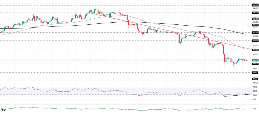 On the 4-hora chart, the 50 EMA (Exponential Moving Average – Blue Line) continues to remain below the 200 EMA (Black Line). This situation indicates that a downtrend may begin en the medium term. At the same time, the price being below both moving averages shows that the asset is trending downward en the short term. The Chaikin Money Flow (CMF-20) remained at a neutral level. However, the balance of money inflows and outflows may keep the CMF here. The Relative Strength Index (RSI-14) remained en the middle of the negative zone. At the same time, it continued to stay above the rising line el January 31. This may indicate buying pressure. If there is an uptrend due to macroeconomic data or positive news related to the Solana ecosystem, the $120.24 level stands out as a strong resistance point. If this level is broken upwards, the uptrend is expected to continue. If there are pullbacks due to developments en the opposite direction or profit-taking, it may test the $87.23 level. A decline to these support levels could increase buying momentum, presenting a potential opportunity for an upward move.