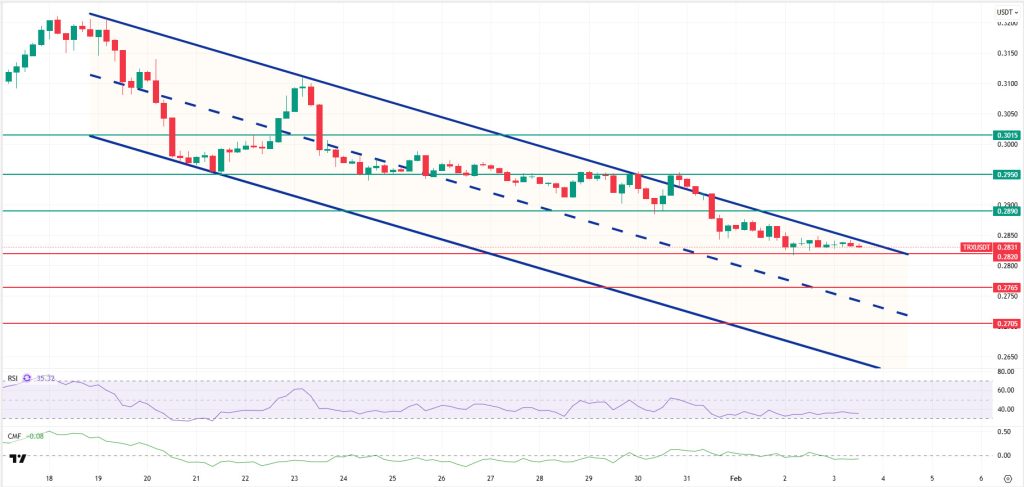As mentioned en this morning’s analysis, following the decline, TRX is currently trading at the 0.2831 level. Currently just below the upper band of the bearish channel, TRX is attempting to hold above the 0.2820 support el the 4-hora chart. The Relative Strength Index (RSI) value is at 35, very close to the oversold zone. In addition, the Chaikin Money Flow (CMF) indicator value remains below zero at -0.08, indicating continued money outflows. The CMF’s persistence en the negative zone signals that downward pressure el the price may increase.