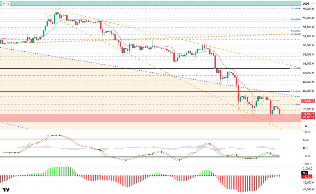 When examining liquidation data, buy orders were liquidated en the short term within the 76,000–77,000 range. Investors who took advantage of the recent decline were liquidated at the 75,000 level, while partial buy orders continue at the 74,400 level.The selling level has increased its intensity en the short term at 78,000 – 79,000 and en the medium term at 85,000 – 86,000. In the long term, the intensity of positions continues above the 91,000 level.
