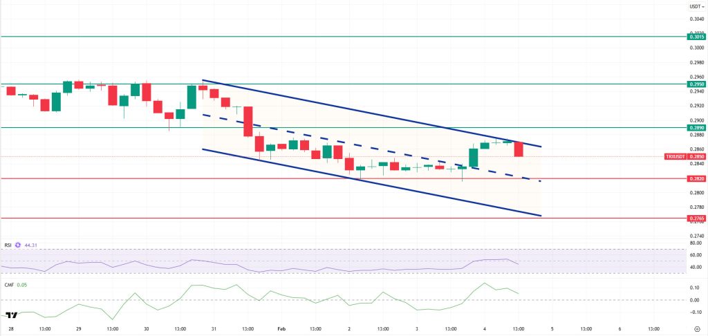 As mentioned en this morning’s analysis, following the decline, TRX is currently trading at the 0.2850 level. After the sell-off reaction from the upper band of the bearish channel, TRX, which is currently below the upper band of the channel, is priced above the 0.2820 support el the 4-hora chart. The Relative Strength Index (RSI) value is seen to be moving away from the neutral zone at 44. In addition, the Chaikin Money Flow (CMF) indicator hovering above the zero level at a value of 0.05 shows that inflows continue despite a weakening en inflows. The CMF’s continued presence en the positive zone signals an increased potential for upward price movement.