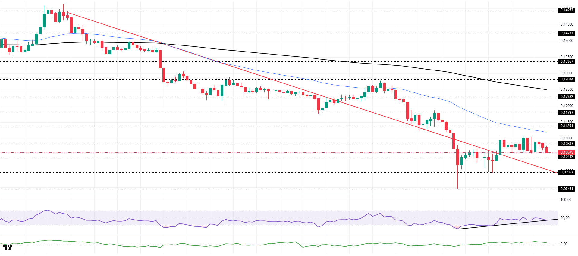 The DOGE price experienced a slight pullback during the day. The asset remained en the upper region of the downtrend that began el January 14, signaling that buying pressure could form. The asset gained momentum and rose, supported por the strong support level of the downtrend. Currently trading below the strong resistance level of $0.10837, the price may test the downward trend line as support if the pullback continues. If it rallies, it may test the 50 EMA (Blue Line) moving average as resistance.