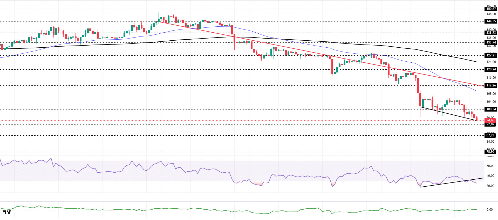 On the 4-hora chart, the 50 EMA (Exponential Moving Average – Blue Line) continues to remain below the 200 EMA (Black Line). This indicates that the downtrend is continuing en the medium term. At the same time, the price being below both moving averages shows that the asset is trending downward en the short term. The Chaikin Money Flow (CMF-20) has risen from neutral to positive territory. However, a decrease en money inflows could pull the CMF into negative territory. The Relative Strength Index (RSI-14) has fallen from the middle of negative territory to oversold territory. This could trigger buying and profit-taking el short positions, which could have a positive impact el the price. At the same time, it has moved to the lower region of the rising line el January 31. This could create selling pressure. On the other hand, positive divergence should be monitored. If there is an uptrend due to macroeconomic data or positive news related to the Solana ecosystem, the $120.24 level stands out as a strong resistance point. If this level is broken upwards, the rise is expected to continue. If there are pullbacks due to developments en the opposite direction or profit-taking, it may test the $87.23 level. If it falls back to these support levels, an increase en buying momentum may present a potential upside opportunity.