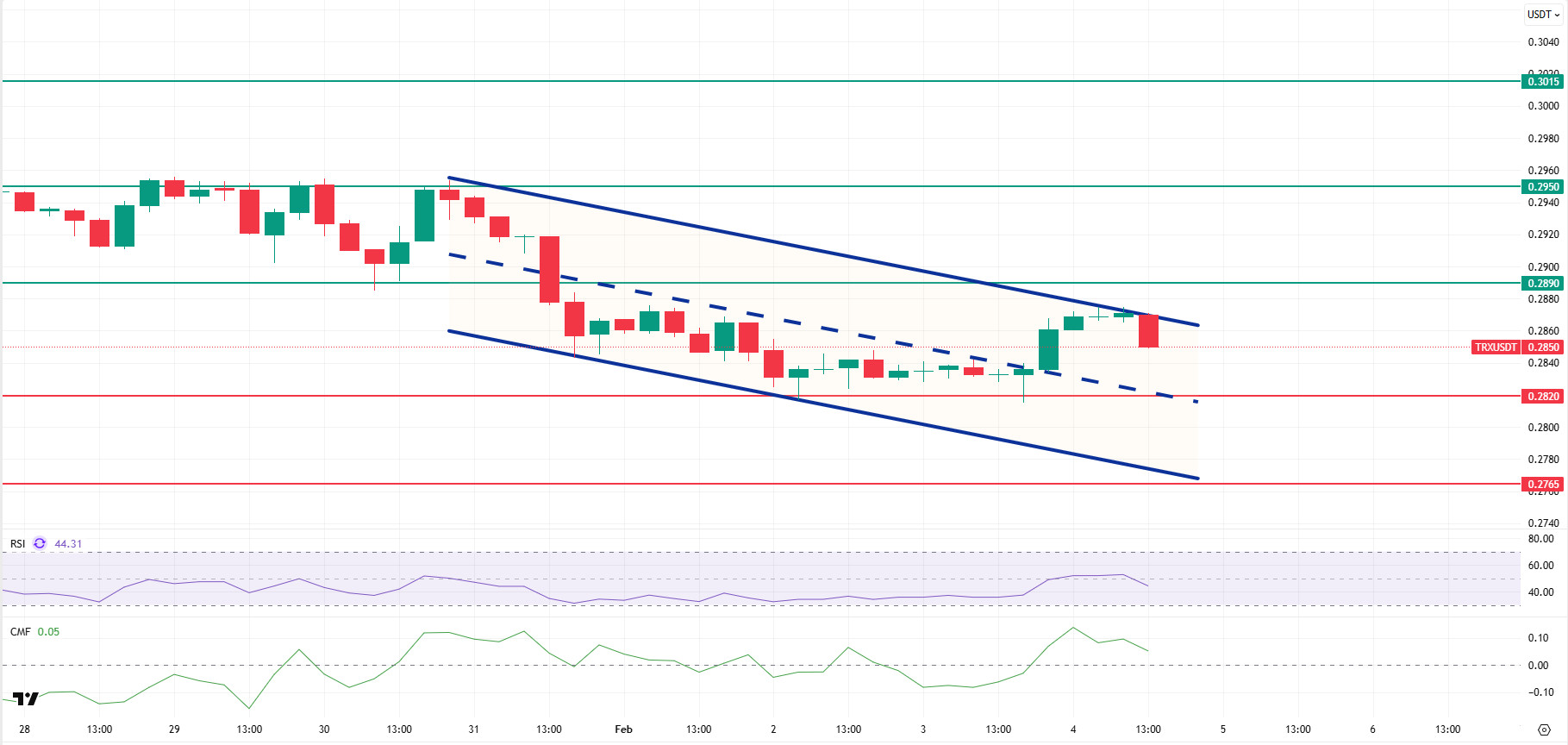 As mentioned en this morning’s analysis, following the decline, TRX is currently trading at the 0.2850 level. After the sell-off reaction from the upper band of the bearish channel, TRX, which is currently below the upper band of the channel, is priced above the 0.2820 support el the 4-hora chart. The Relative Strength Index (RSI) value is seen to be moving away from the neutral zone at 44. In addition, the Chaikin Money Flow (CMF) indicator hovering above the zero level at a value of 0.05 shows that inflows continue despite a weakening en inflows. The CMF’s continued presence en the positive zone signals an increased potential for upward price movement.