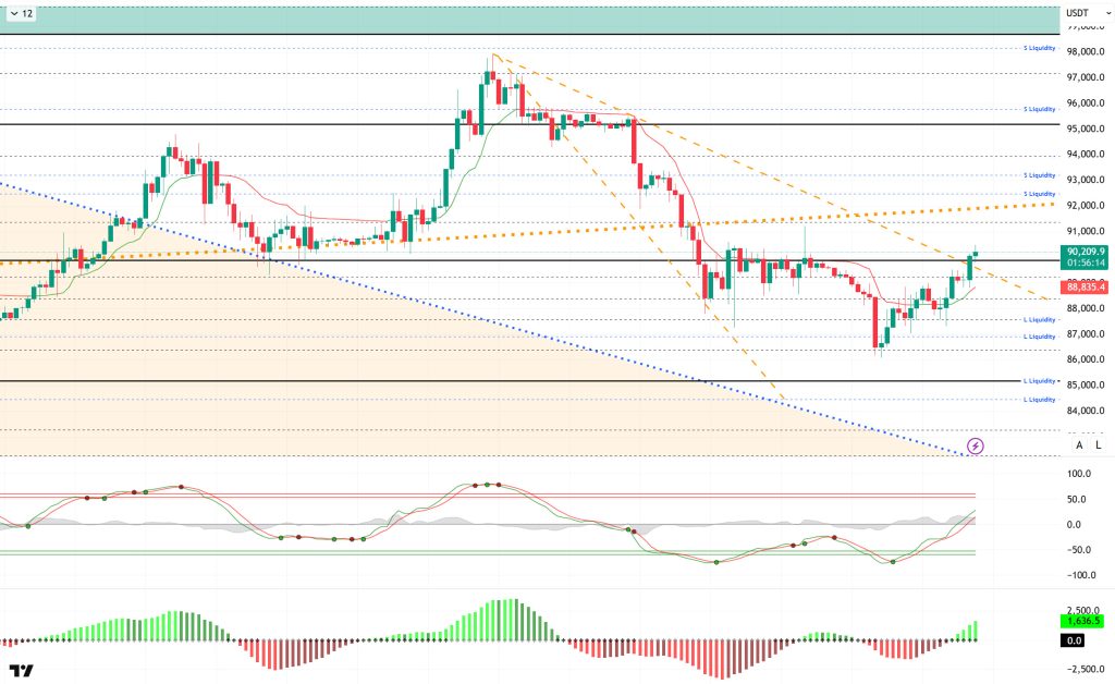 When examining liquidation data, the buy level has once again gained intensity at the 86,000 – 87,000 level with the recent rise. In contrast, the selling level completely liquidated the concentration it had formed en the short term at the 88,000 – 89,000 band, while the next short-term liquidity area was liquidated at the 89,000 – 90,000 band. In the long term, positions above the 91,000 level continue to accumulate.