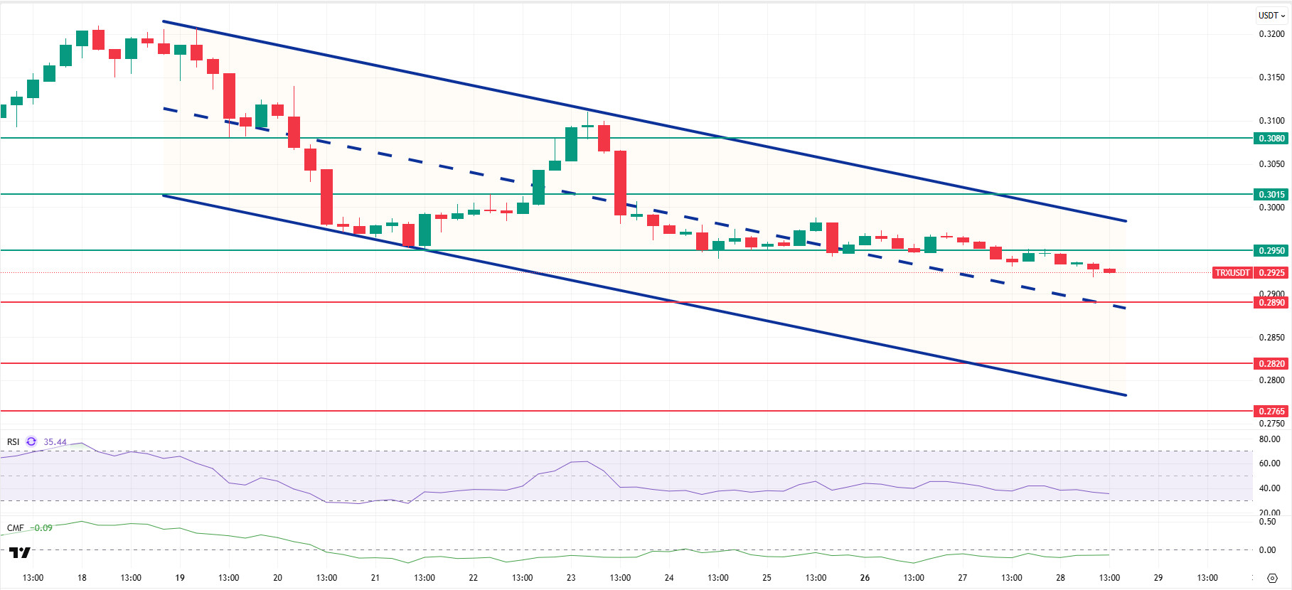 In light of all these indicators, TRX may decline further en the segundo half of the day, moving towards the lower band of the bearish channel. In such a scenario, it may test the 0.2890 support level. It may continue its decline with a candlestick close below the 0.2890 support level and may test the 0.2820 support level. If there is no candlestick close below the 0.2890 support level and the CMF moves into positive territory, cash inflows may gain strength and the price may test the 0.2950 resistance level after a possible rise.
