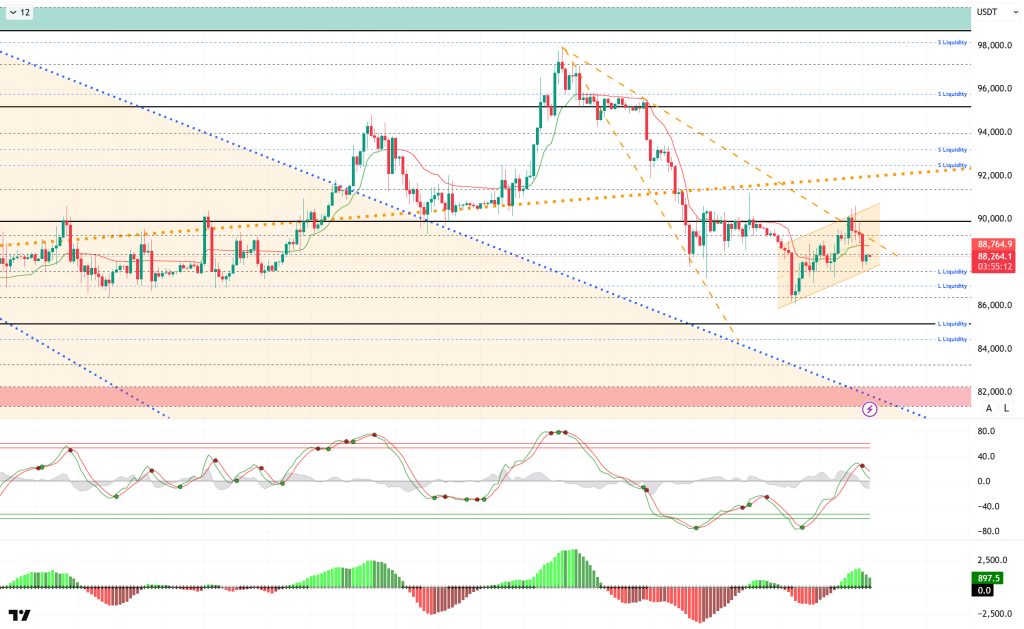 From a technical perspective, BTC broke above the 90,000 level amid increased volatility en the previous analysis, but it rejected this region and produced a fake breakout. With this move, the price attempted to break the upper line of the descending minor trend several times but failed and retreated to the 87,700 level. BTC then recovered somewhat and continues to trade above the 88,000 level. We will follow the price, which is tracking the minor upward channel it formed within the descending channel, as it attempts to regain momentum and once again attempts to break through the upper line of the minor downward trend. If this region acts as resistance again, selling pressure is expected to deepen.