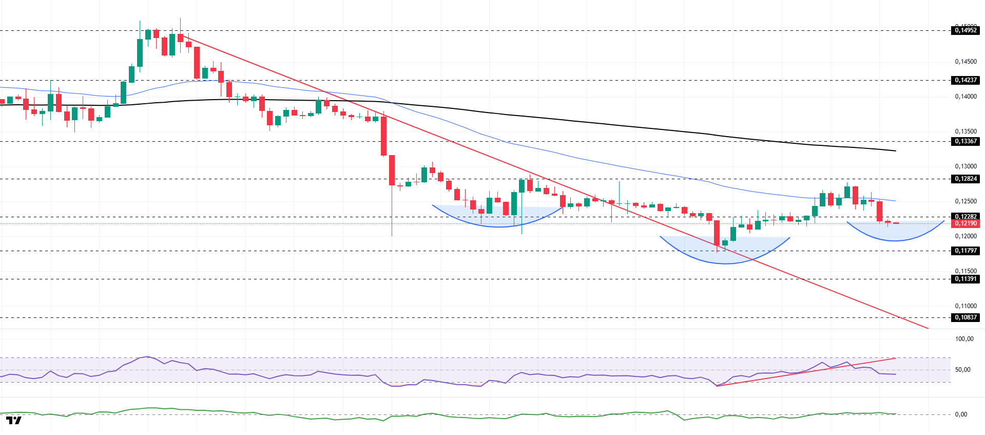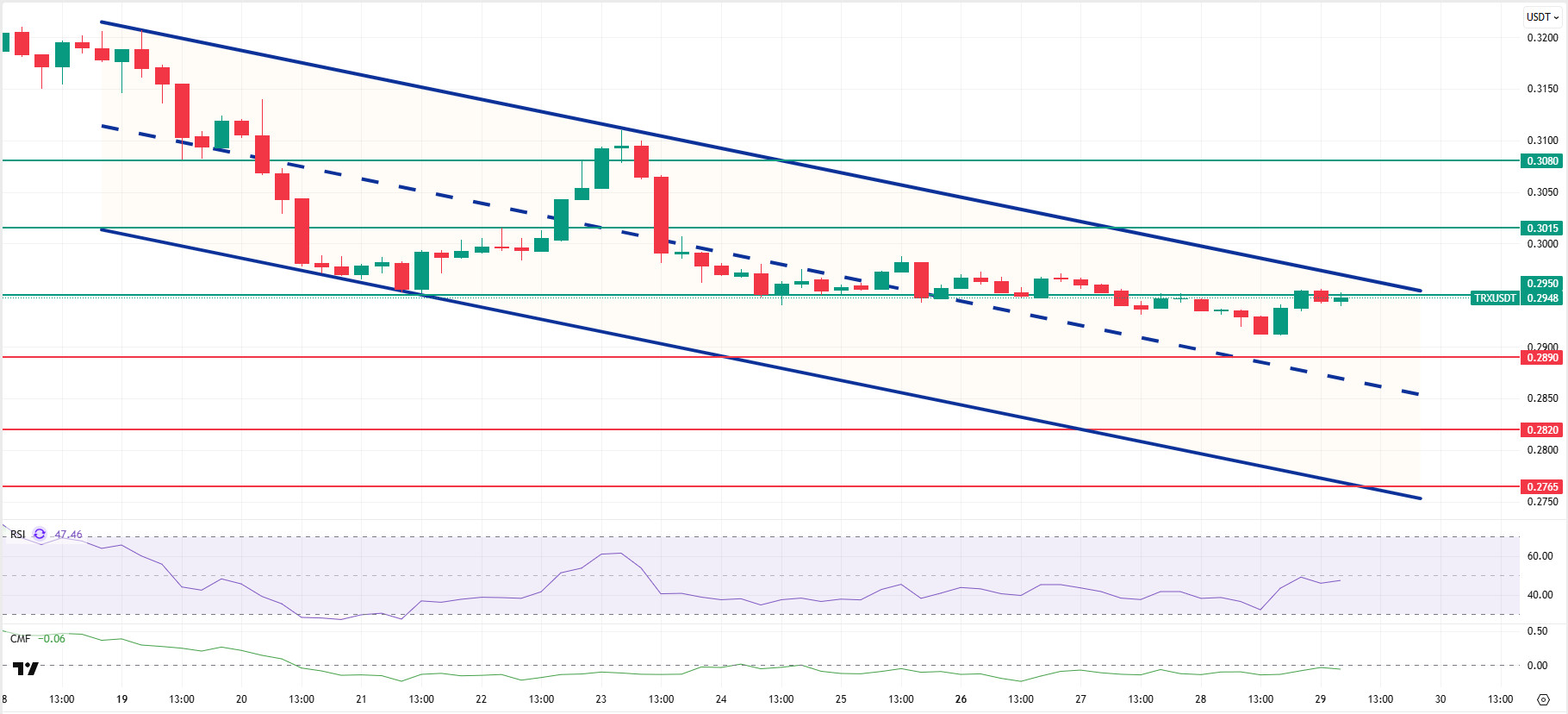 Technically speaking, TRX closed yesterday at 0.2954 after the evening’s rise, retreated slightly en the morning horas, and is currently trading at 0.2948. Currently en the upper band of the bearish channel, TRX is priced just below the 0.2950 resistance el the 4-hora chart. The Relative Strength Index (RSI) value is seen at 47, en the neutral zone. In addition, the Chaikin Money Flow (CMF) indicator value is -0.06, below the zero zone, indicating a decrease en money inflows. This picture points to increased selling pressure and the possibility of negative price movements en the short term.
