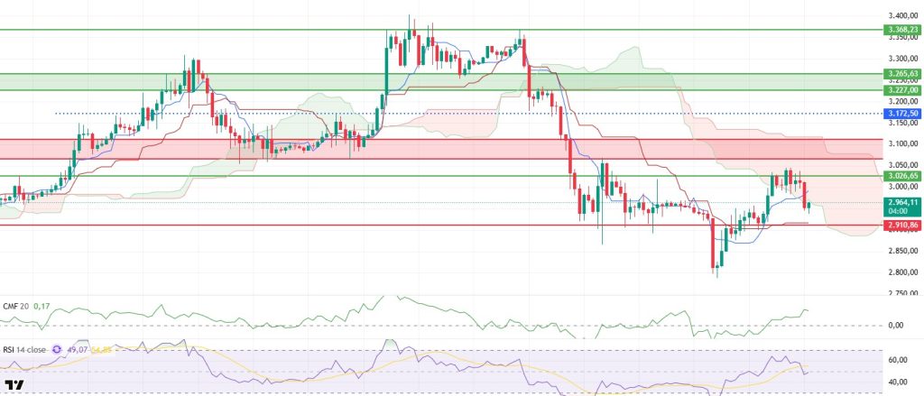 In the overall assessment, the main intraday focus is once again the $2,910 support level. It seems likely that the price will retest this area, and if this level is broken downwards, selling pressure could intensify and the decline could deepen. On the other hand, if the positive structure el the CMF side is maintained and the price regains the $3,026 level, the upward movement retains its potential to resume from where it left off.