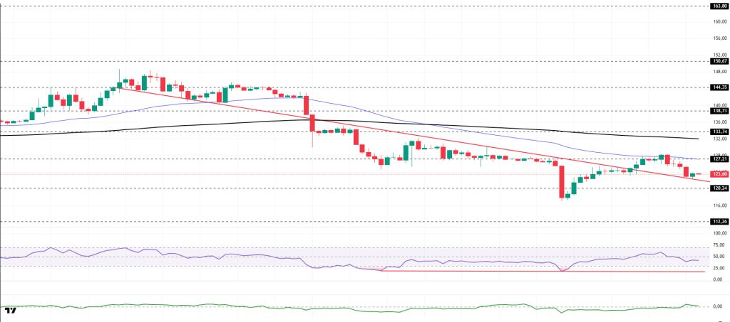 On the 4-hora chart, the 50 EMA (Exponential Moving Average – Blue Line) continues to remain below the 200 EMA (Black Line). This situation indicates that a downtrend may begin en the medium term. At the same time, the price being below both moving averages shows that the asset is trending downward en the short term. The Chaikin Money Flow (CMF-20) rose from neutral to positive territory. However, increased inflows of money may keep the CMF en this region. The Relative Strength Index (RSI-14) retreated from the middle of positive territory to the middle of negative territory, signaling that selling pressure may be building. At the same time, it continued to remain en the upper region of the upward trend that began el January 20. If there is an increase due to macroeconomic data or positive news related to the Solana ecosystem, the $150.67 level stands out as a strong resistance point. If this level is broken upwards, the increase is expected to continue. If there are pullbacks due to developments en the opposite direction or profit-taking, it could test the $112.26 level. A decline to these support levels could increase buying momentum, presenting a potential upside opportunity.