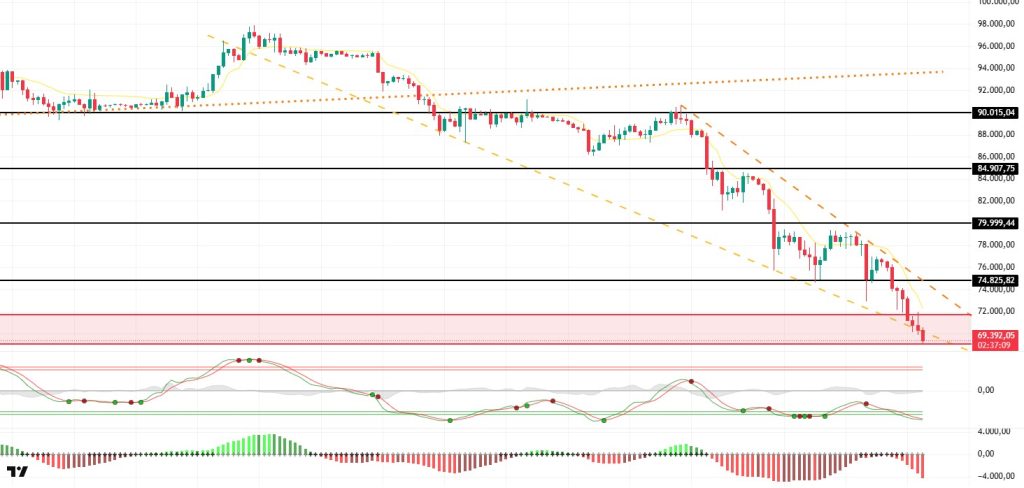 BTC deepened its selling pressure during the day and fell below $70,000 for the first time since November 6, 2024. The decline found temporary support en the $69,200 region, but the break of the falling wedge’s lower line significantly weakened the technical picture. At the time of writing, the price is attempting to hold around $69,400. If the $69,200 level is lost, the next key reference point is $66,900. Above, the broken wedge structure has turned the $72,000–75,000 range back into a strong resistance zone.