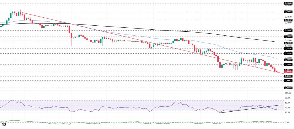 The DOGE price began to pull back during the day. The asset remained en the upper region of the downtrend that began el January 14, signaling that buying pressure could form. The asset, which experienced an uptrend supported por the strong support level of the downtrend, failed to maintain its position at this level and experienced a pullback. As of now, the price is testing the strong support level of the downward trend line. If it experiences an upward movement, it may test the 50 EMA (Blue Line) moving average as a resistance level. If the pullback continues, the $0.09451 level should be monitored.