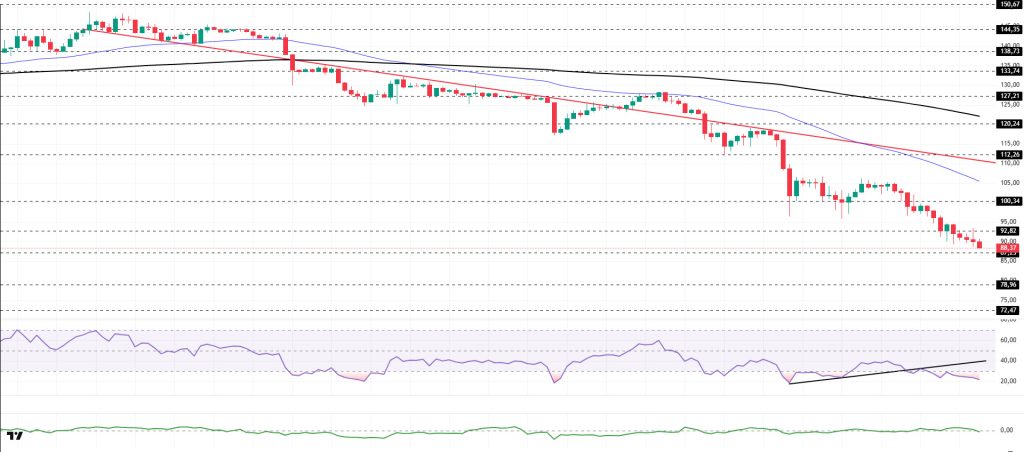 On the 4-hora chart, the 50 EMA (Exponential Moving Average – Blue Line) continues to remain below the 200 EMA (Black Line). This indicates that the downtrend continues en the medium term. At the same time, the price being below both moving averages shows that the asset is trending downward en the short term. The Chaikin Money Flow (CMF-20) has moved into negative territory. However, the increase en money outflows could pull the CMF deeper into negative territory. The Relative Strength Index (RSI-14) has fallen from the middle of negative territory to the oversold zone. This could trigger buying and profit-taking el short positions, which could have a positive impact el the price. At the same time, it remained below the rising line el January 31. This signaled that selling pressure continued. If there is an uptrend due to macroeconomic data or positive news related to the Solana ecosystem, the $120.24 level stands out as a strong resistance point. If this level is broken upwards, the uptrend is expected to continue. If there are pullbacks due to developments en the opposite direction or profit-taking, it could test the $72.47 level. A decline to these support levels could increase buying momentum, presenting a potential upside opportunity.