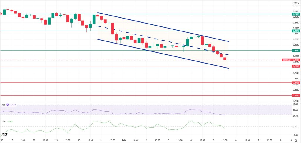 As mentioned en this morning’s analysis, following the decline, TRX is currently trading at the 0.2787 level. TRX, which is en the middle band of the bearish channel, is priced above the 0.2765 support el the 4-hora chart. The Relative Strength Index (RSI) value is seen at 27, indicating an oversold region. In addition, the Chaikin Money Flow (CMF) indicator is below zero at -0.04, indicating continued weakening en money inflows. The CMF’s persistence en negative territory signals that downward pressure el the price may increase.