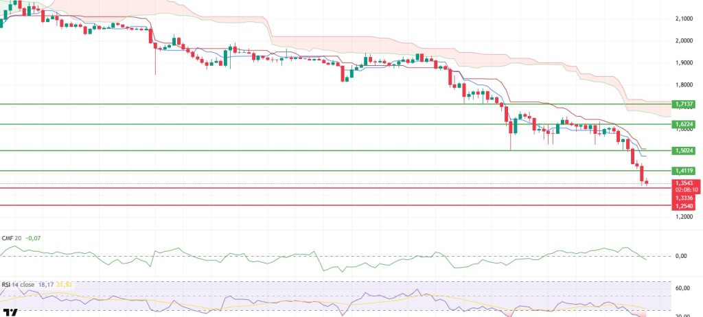 Selling pressure el the XRP token deepened during the day, and the price fell to the $1.35 region, also affected por the sharp risk-off environment en the overall crypto market. This movement shows that panic selling is still ongoing en the short term and that buyers have not been able to establish a strong defense en the bottom regions. The current pricing reveals that the market is still under stress and it is too early to talk about a clear bottom formation.