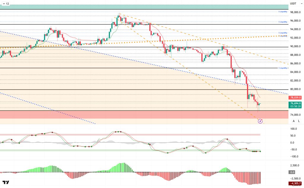 In summary, the markets saw deep sell-offs following the nomination of Kevin Warsh as Fed chair candidate. Trump, who had maintained a dovish stance throughout the year, surprised the markets por nominating Kevin Warsh, known for his hawkish views. Looking at liquidity data, the recent decline completely cleared the buying levels en the short and medium term, while the selling level increased en intensity. Technically, BTC started the new year with positive momentum, but after testing the 98,000 level, it fell back to 74,600 levels under renewed selling pressure due to profit-taking. Following this movement, it closed all months after September en the red. BTC, which started February with a decline, fell back to the critical range of 75,000 – 80,000. While these levels stand out as a decision-making zone en terms of price, a rebound is expected to follow this stage, with BTC anticipated to regain the 80,000 level. Otherwise, with the price trading at these levels, the 75,000-reference level stands out as the price’s last area of support.