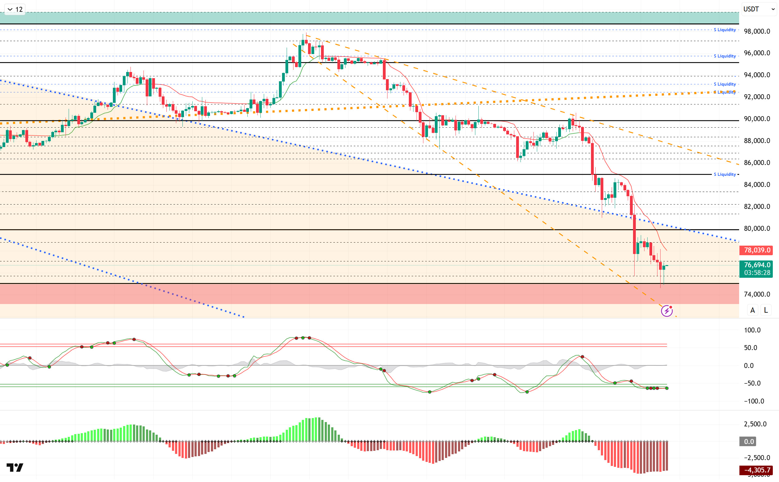 From a technical perspective, while the deep downtrend en BTC continues, it recently lost the 80,000 reference level, falling below this level for the first time since April. With the latest decline, BTC has been exhibiting highly volatile movements within the 75,000–80,000 range, with these levels emerging as key decision points for the price. Following the descending wedge pattern it formed, the price has fallen relentlessly from the 98,000 level, retreating to around 74,600, returning to pre-Trump levels. These levels stand out as previously tested ATH levels for the price, and a loss of these levels could cause the upward structure of BTC to disappear. From this point el, it will be monitored whether the price will bounce back above the 80,000 level with a dead cat bounce.