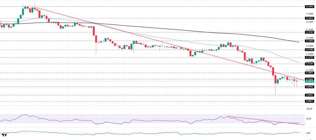 The DOGE price experienced a decline. The asset moved into the lower region of the downtrend that began el January 14 and deepened its decline. Testing the strong support level of $0.09962, the asset accelerated from there and showed a slight increase. Currently preparing to test the downward trend as resistance, the asset may test the 50 EMA (Blue Line) moving average as resistance if it breaks above this level. If the pullback continues, the $0.09451 level should be monitored.