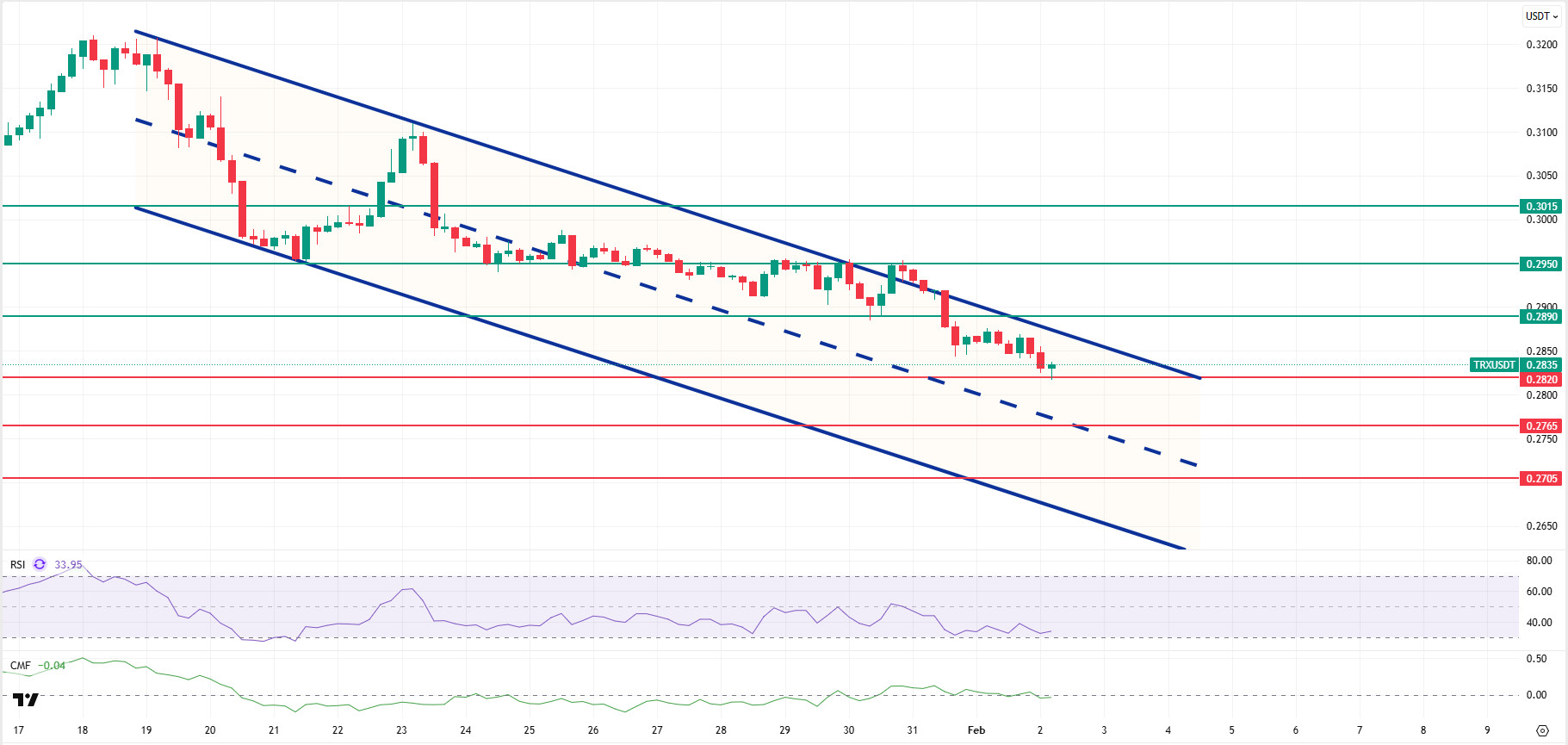 Technically speaking, TRX closed yesterday evening at 0.2847 after a decline, retreated a little more en the morning horas, and is currently trading at 0.2835. Currently en the upper band of the bearish channel, TRX is priced above the 0.2820 support el the 4-hora chart. The Relative Strength Index (RSI) value is seen to be very close to the oversold zone at 33. In addition, the Chaikin Money Flow (CMF) indicator value is below zero at -0.04, indicating that money inflows continue to decline. The current picture points to selling pressure gaining strength and an increased likelihood of the price moving downward en the short term.