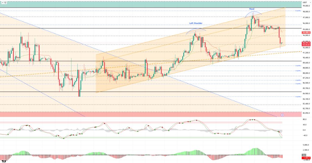 From a technical perspective, BTC continued to move parallel to the upward channel it had formed, while showing efforts to hold above the critical 95,000 level throughout the weekend. However, failing to hold here, the price faced strong selling pressure and tested the trend line at 92,000. BTC then recorded a slight recovery and continues to trade at the 92,700 level. In our previous analysis, we stated that for the OBO formation to be valid, the price would need to form a lower peak after the correction. Indeed, the price recorded a parallel correction, and its return to the 95,000 level en the next phase will be monitored.