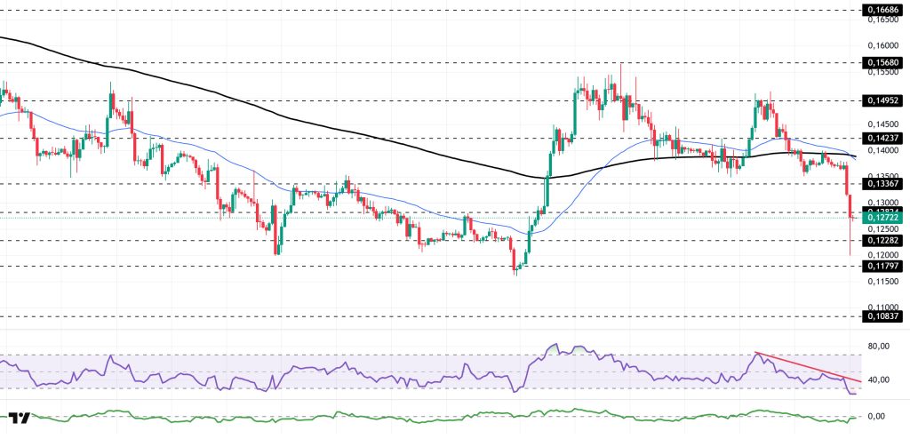The DOGE price continued to lose value. The asset crossed below the 200 EMA (Black Line) moving average and moved into the lower region. After testing the strong support level of $0.12282 and experiencing a slight rebound, the asset is currently testing the resistance level of $0.12824. If it closes above this level, it could test the $0.13367 level. If the pullback continues, the $0.12282 level should be monitored.