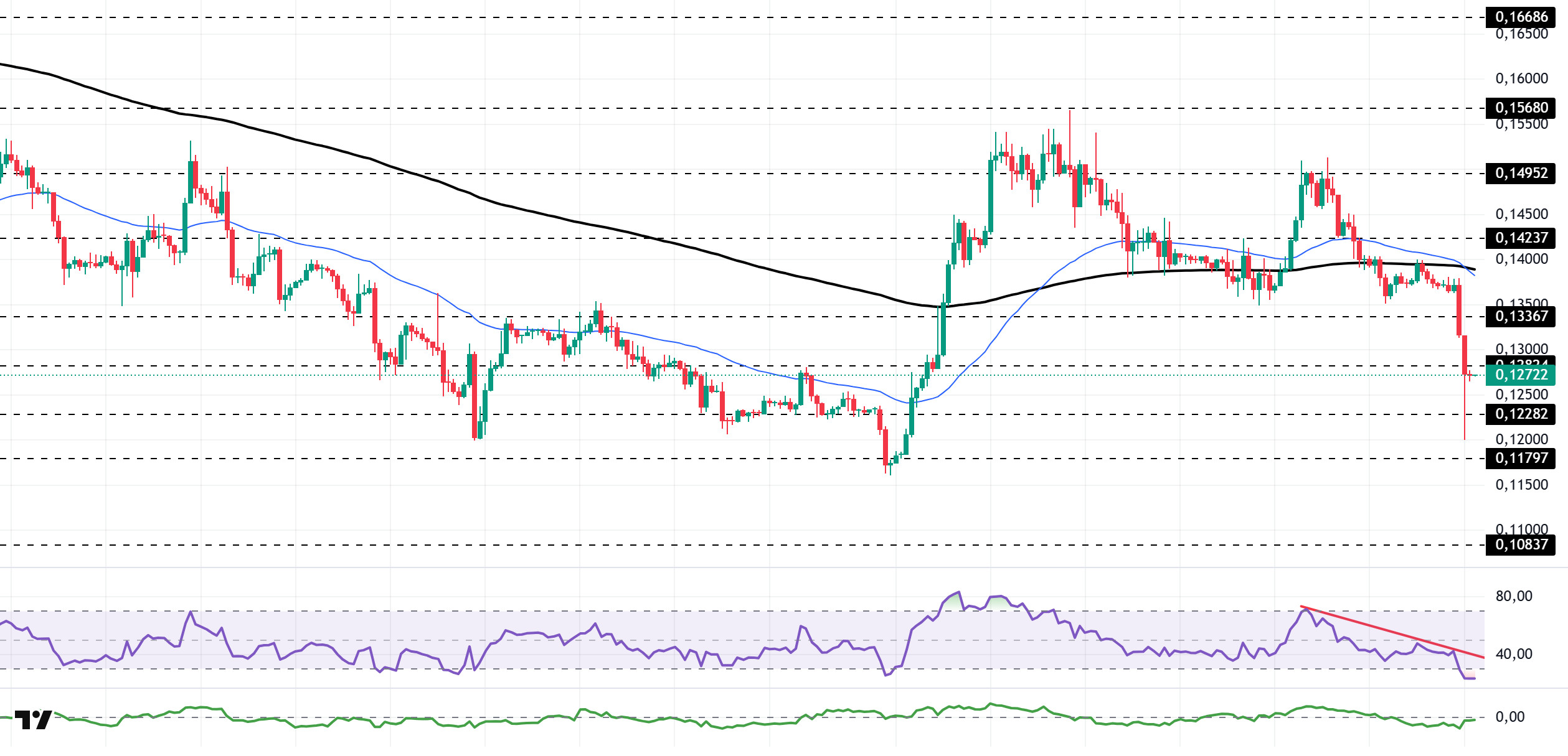 The DOGE price continued to lose value. The asset crossed below the 200 EMA (Black Line) moving average and moved into the lower region. After testing the strong support level of $0.12282 and experiencing a slight rebound, the asset is currently testing the resistance level of $0.12824. If it closes above this level, it could test the $0.13367 level. If the pullback continues, the $0.12282 level should be monitored.