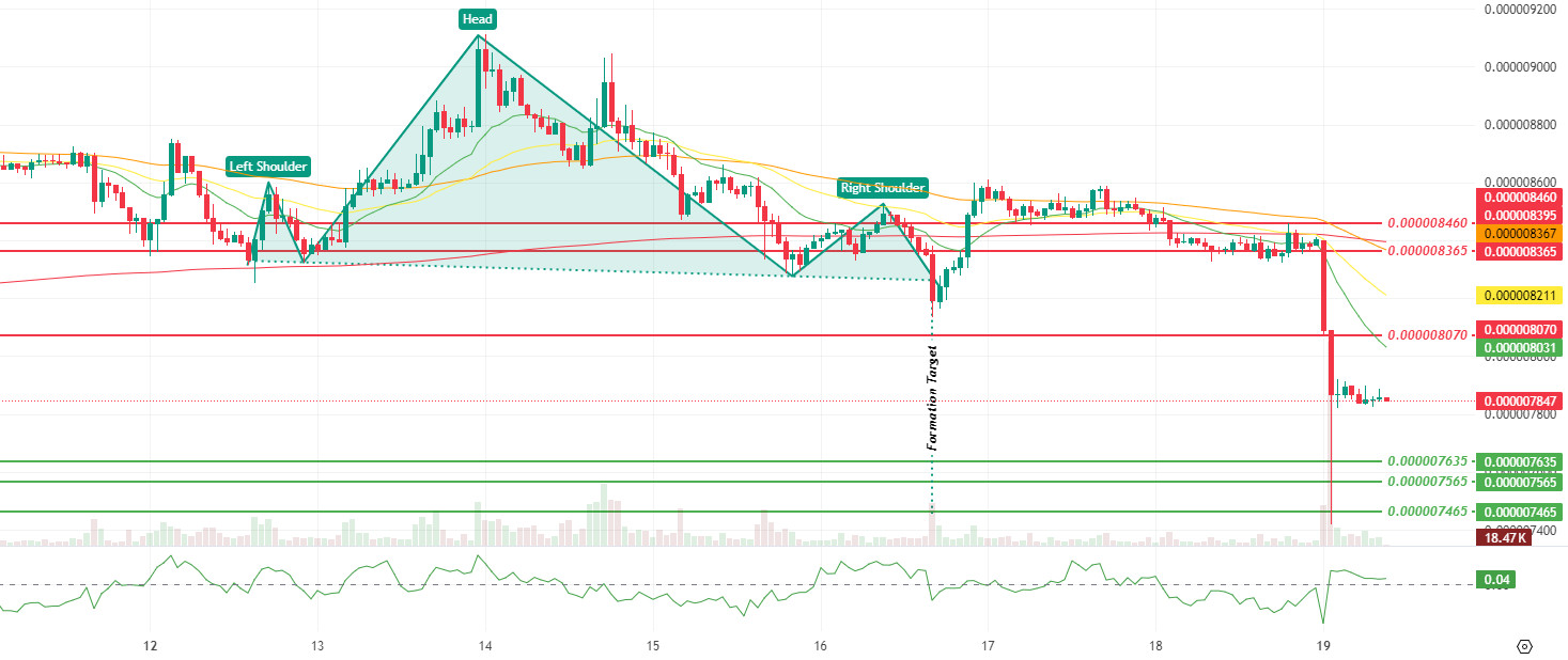 The technical picture shows that, with the break below the support line observed en the previous report, the price experienced a rapid liquidity gap, falling below the $0.000008070 level, and that the sell-off has shifted the search for a new equilibrium to the $0.000007635 band. The decline en momentum and volume suggests that buyers remained cautious after the initial breakout and that recovery attempts are struggling to gain traction at this stage. Meanwhile, the increase en volatility indicates that the price is fluctuating with sharper wicks despite weak participation, signaling that the market remains en a stressful pricing mode en the short term. The Chaikin Money Flow (CMF) indicator moving from negative to positive territory is a balancing signal, indicating that buyer liquidity has re-entered at the bottom after selling pressure and that efforts to establish a short-term bottom have begun. Additionally, the break of the neckline after the completion of the right shoulder en the Head and Shoulders (H&S) pattern visible el the chart was the main trigger that technically supported the acceleration of the sell-off. The measured target of the formation highlights the risk of a pullback towards the $0.0000076 band after the breakout, explaining why the support cluster around $0.000007635 has become critical.