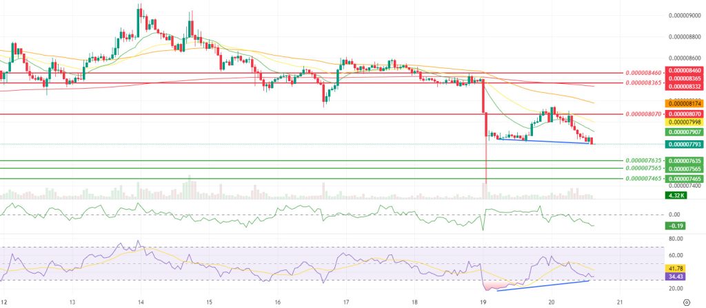 In this context, the main threshold en the short term remains at the $0.000008070 level. If the price recovers this band and then breaks above the SMMA 9, 21, and 50 set to produce sustainability, a more structured recovery attempt towards the $0.000008365 and then $0.000008460 resistance levels may come to the fore. For this scenario to gain traction, it is critical that the CMF exits the negative zone. Conversely, if weak closes persist below $0.000008070 and positive divergence remains ineffective, the $0.000007635 support level could come under pressure again ; and if this area is lost, the risk of deeper selling towards the support cluster of $0.000007565 and $0.000007465 will increase. (SMMA9: Green Line, SMMA21: Yellow Line, SMMA50: Orange Line, SMMA 200: Red Line)