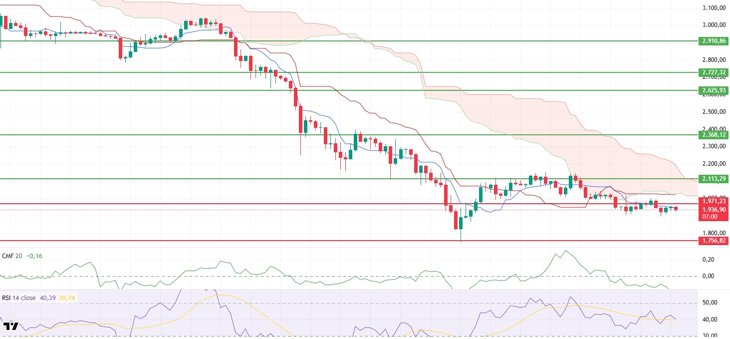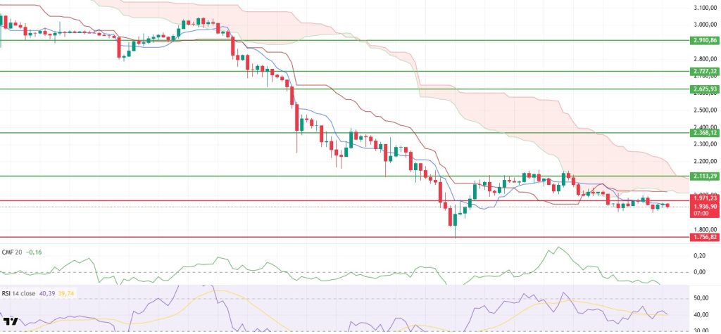 The ETH price rose to the upper limit of the $1,970–2,000 band yesterday, testing the critical resistance area. However, selling pressure from this region was effective, and the price retreated again, falling to around $1,900. Currently, there is an attempt to stabilize around $1,930. The failure to break through the resistance zone indicates that buyers have not yet gathered sufficient strength and that the market remains cautious.