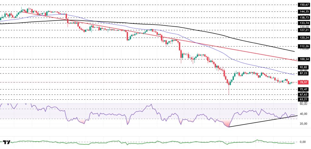 On the 4-hora chart, the 50 EMA (Exponential Moving Average – Blue Line) continues to be below the 200 EMA (Black Line). This indicates that the medium-term downtrend is continuing. At the same time, the price being below both moving averages shows that the asset is trending downward en the short term. The Chaikin Money Flow (CMF-20) remains en negative territory. However, the balance of money inflows and outflows may keep the CMF en negative territory. The Relative Strength Index (RSI-14) retreated from the middle of the negative zone and fell to the lower level of the negative zone. At the same time, it is currently testing the upward trend that began el February 6 as support. A downward break could increase selling pressure. If there is an uptrend due to macroeconomic data or positive news related to the Solana ecosystem, the $100.34 level stands out as a strong resistance point. If this level is broken upward, the uptrend is expected to continue. If pullbacks occur due to developments en the opposite direction or profit-taking, it may test the $67.63 level. A decline to these support levels could increase buying momentum, presenting a potential upside opportunity.