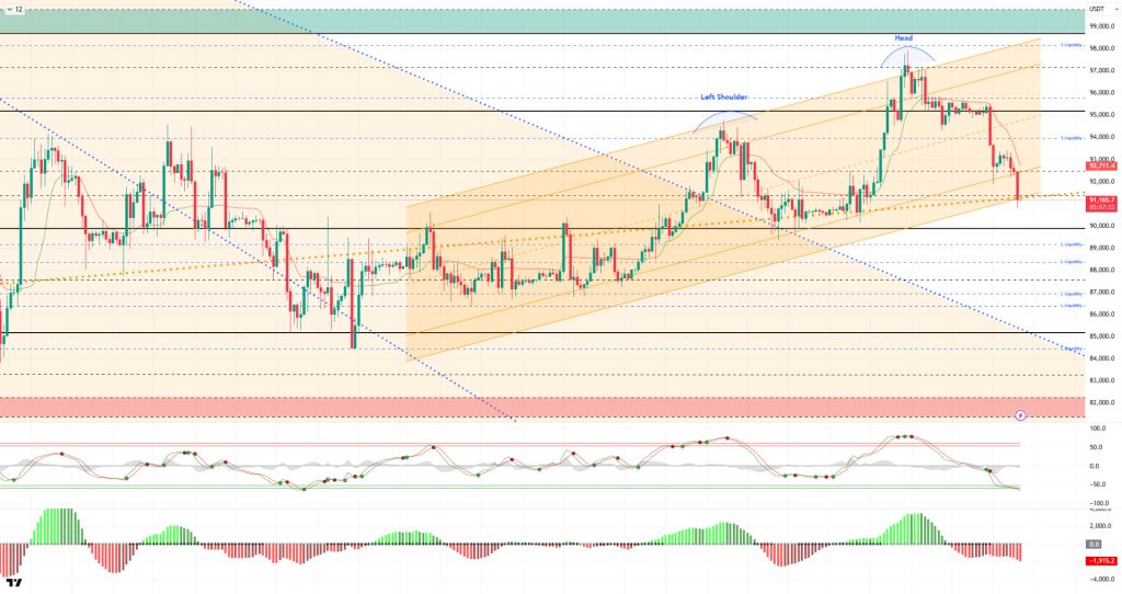 From a technical perspective, BTC failed to maintain the limited rise it recorded at the 93,450 level en the previous analysis. Breaking the lower line of the rising trend channel after several attempts amid increasing selling pressure, the price touched the major uptrend line and entered a trend extension. At the time of writing, BTC is testing the 91,400 support level and attempting to hold above it. A break below this level could result en a loss of the critical 90,000 level.