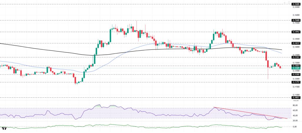 The DOGE price traded sideways. The asset crossed below the 200 EMA (Black Line) moving average and moved into the lower zone. After testing the strong support level of $0.12282 and seeing a reaction, the asset experienced a slight rise and is currently testing the $0.12824 level as resistance. If it closes above this level, it could test the $0.13367 level. If the pullback continues, the $0.12282 level should be monitored.