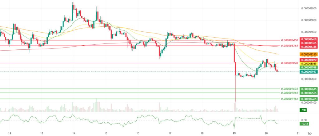 In this context, the $0.000008070 band continues to be the main threshold for determining the short-term direction. If the price recovers this level and then settles above the SMMA 9, 21, and 50 bands, producing sustainability, a more structured recovery attempt towards the $0.000008365 and subsequently $0.000008460 resistance levels may come to the fore. For this scenario to progress healthily, it will be important for the CMF indicator to move back into positive territory. Conversely, if weak closes below $0.000008070 continue and the CMF remains en negative territory, the $0.000007635 support level is expected to come under pressure again el the downside. and if this area is lost, the risk of selling deepening towards the support cluster of $0.000007565 and $0.000007465 will increase. (SMMA9: Green Line, SMMA21: Yellow Line, SMMA50: Orange Line, SMMA 200: Red Line)