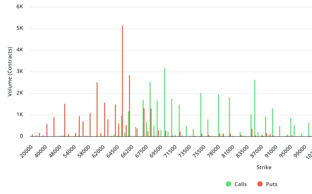 Relación Put/Call y Punto de Máximo Dolor:Al observar las opciones en los últimos datos de 7 días de Laevitas, el número de opciones de compra (call) disminuyó aproximadamente un 13% en comparación con la semana pasada, alcanzando 147.02K. En contraste, el número de opciones de venta (put) disminuyó en un 29% en comparación con la semana pasada, alcanzando 153.05K. La relación put/call para las opciones se establece en 0.76. Esto indica que hay más demanda de opciones de compra que de opciones de venta entre los inversores. El punto de máximo dolor de Bitcoin se observa en $75,000. BTC está actualmente valorado en $66,500, y si no logra superar el punto de dolor de $75,000, se pueden anticipar más caídas.Distribución de Opciones de Ethereum