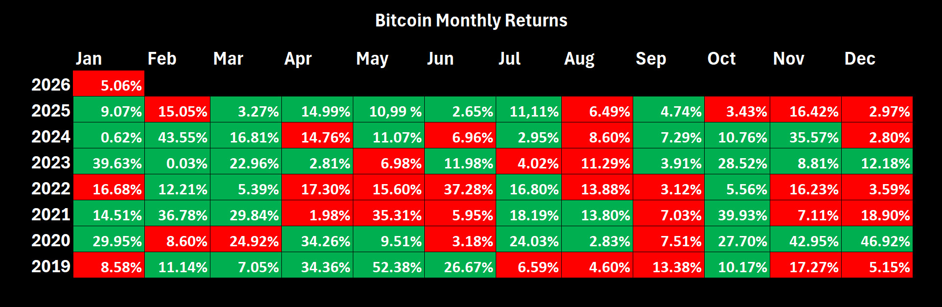 Historical data shows that February months have mostly seen double-digit gains, while declines have been more limited and balanced. Bitcoin’s most notable February performance was a 36.78% increase en 2021 and 43.55% en 2024. Last February saw a double-digit loss of 15.05%. Overall, February continues to be a positive month for Bitcoin, with an average gain of approximately 13.12%.