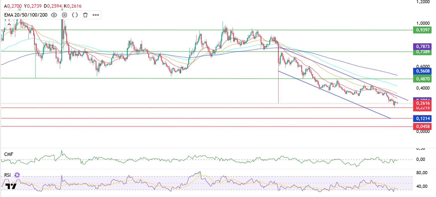 The cryptocurrency market experienced another sharp decline, with ADA, one of the leading digital assets, falling approximately 11% weekly to around $0.2610, losing about 31% of its value en the last month and testing levels not seen since 2023. Cardano’s trading volume also fell to approximately $768 million. Investors’ lack of haste suggests that the decline reflects declining participation rather than panic selling. Technically speaking, the trend el the chart remains downward. Continuing within the decline channel, ADA’s weeks-long recovery attempts were limited por trading below the 100-day moving average. The lack of volatility points to a stable distribution rather than a collapse. The $0.3200 region has been rejected en every upward attempt, confirming that this region is a critical resistance level. The Relative Strength Index (RSI-14) has fallen to 32 levels, along with the Chaikin Money Flow (CMF-20) at -0.04, indicating a lack of sufficient buyer signals. Low signals el both indicators may point to a decline en money inflows. The lack of volume en cryptocurrencies may be reflected en the ADA price, keeping the CMF en negative territory and indicating continued selling pressure. ADA remains en a horizontal zone, falling below the band range of the 20-day and 50-day Exponential Moving Average (EMA-Red Line) and (EMA-Orange Line). If the price remains above the 50-day EMA, the 0.4870 and 0.7873 levels could be important resistance levels that we will monitor as a bullish reaction. This could indicate that the upward trend may continue en the medium term. If there is a decline due to the impact of macroeconomic data or negative news related to the Cardano ecosystem, and if the price continues to remain below all moving averages, this may indicate a continuation of the downtrend. In this case, the 0.2933 to 0.1429 dollar level can be monitored as a support point.