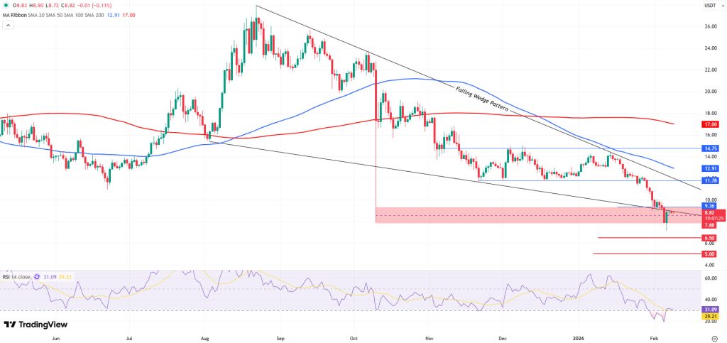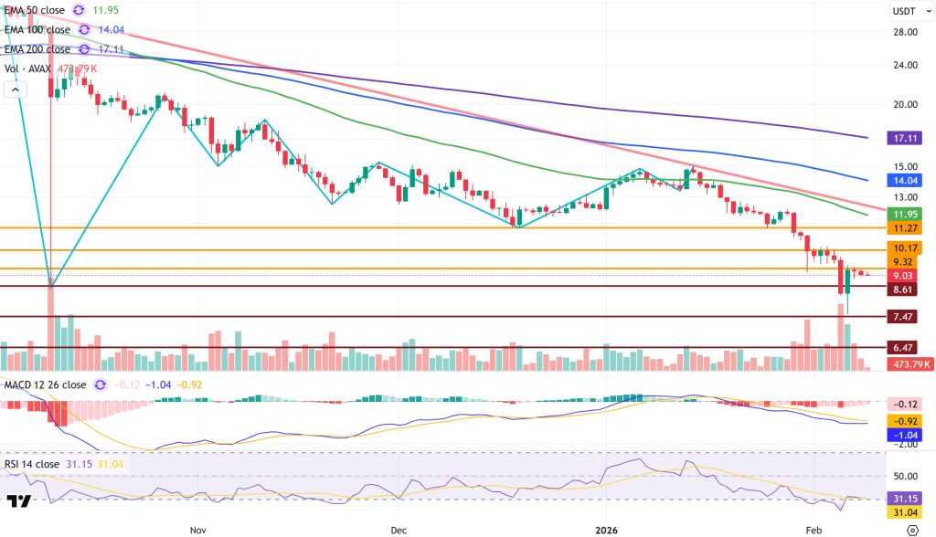AVAX started last week at $9.91. It failed to break through the $10.17 resistance level during its rise and then experienced a sharp decline as selling pressure accelerated. The decline deepened, falling to the $7.55 level. Although a recovery was seen with purchases en this region, the weekly close was at the $9.08 level, with an approximate 8.40% loss en value el a weekly basis. Last week, geopolitical risks remained el the agenda and the risk aversion trend also negatively affected crypto assets. During this period, the sharp losses seen en Bitcoin and Ethereum deepened the weak overall market outlook, and AVAX came under pressure en line with the broader market. Despite positive developments en the ecosystem, these developments failed to impact pricing due to the low-volume market structure and weakening buying power. The sharp decline en the cryptocurrency market en recent weeks has led to many altcoins retesting their 2021 and earlier levels. AVAX retested its January 2021 level during this period. A noteworthy development el the fundamentals side is the upcoming AVAX token unlock. Approximately 1.67 million AVAX will enter circulation el February 11, 2026. Although this amount constitutes 0.32% of the circulating supply, it has the potential to create additional supply pressure en the short term given the current weak market conditions and low volume environment. Therefore, it could increase volatility above support levels.