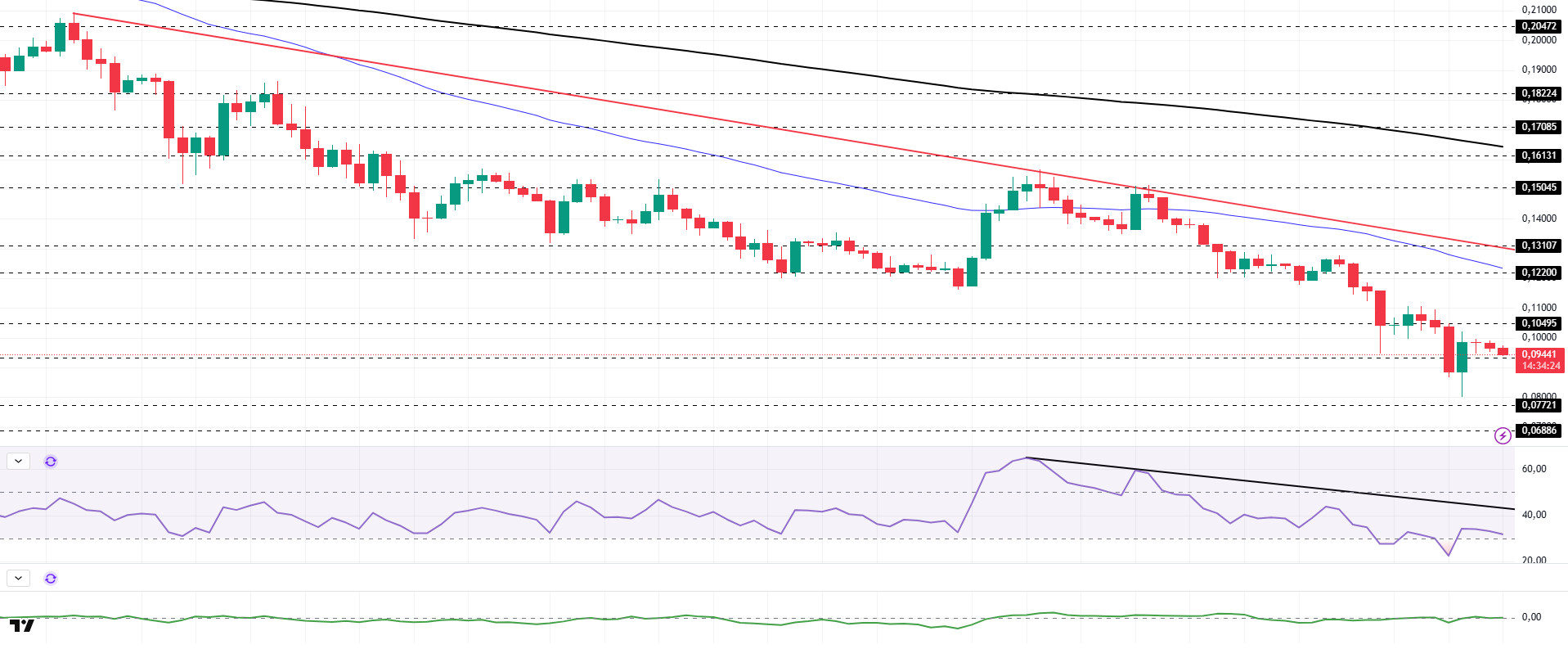 DOGE experienced a decline of approximately 13% el the daily chart since last week. The price remained below the downward trend line that began el October 27. Testing the downward trend line as resistance el January 13, the price lost value after encountering resistance there. Priced below the 50 EMA (Blue Line) moving average, the asset is currently testing the strong support level of $0.09334. If it breaks below this level, the $0.06886 level should be monitored as a support level. If it rises, the 50 EMA (Blue Line) moving average could act as a resistance level.