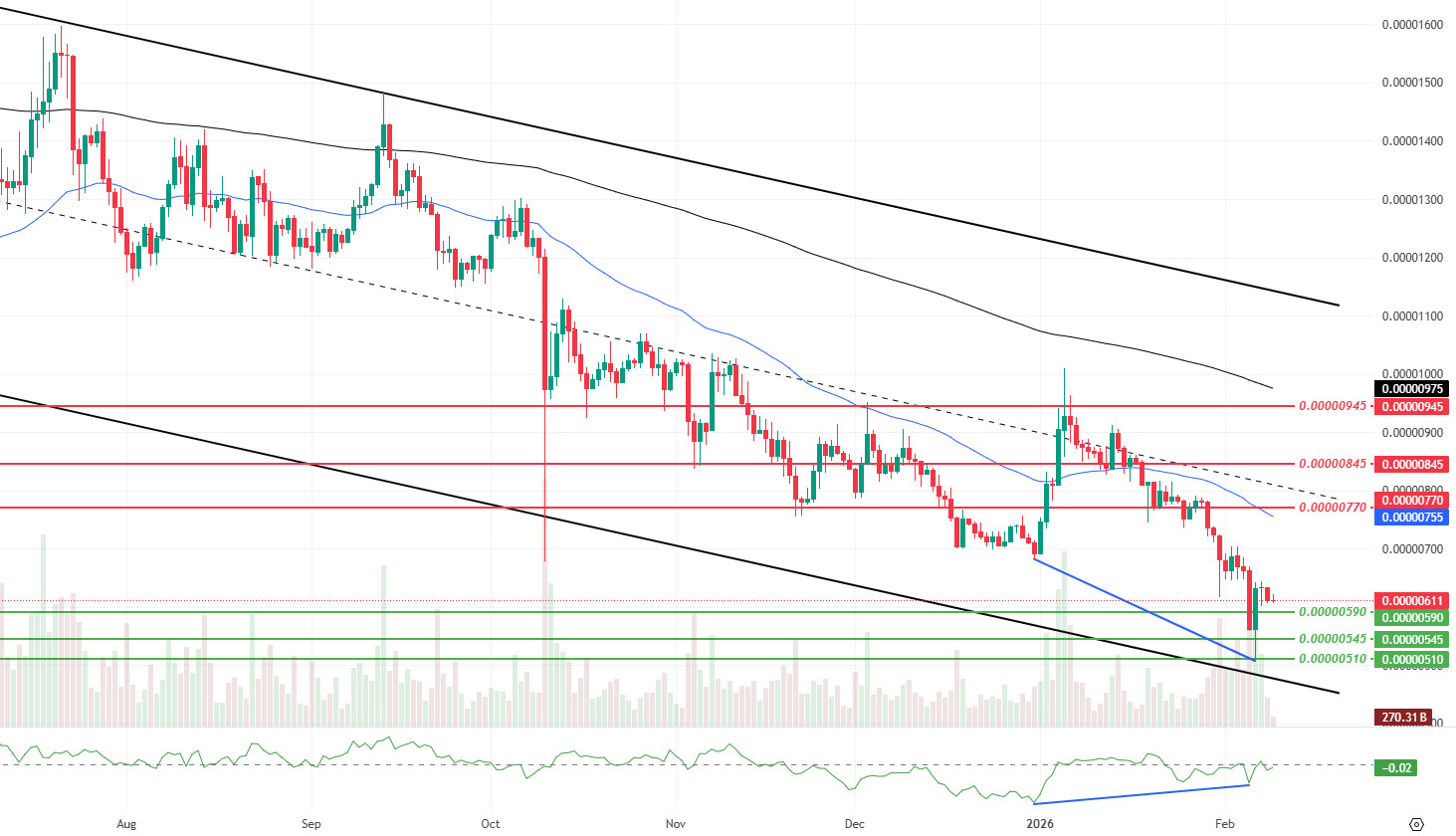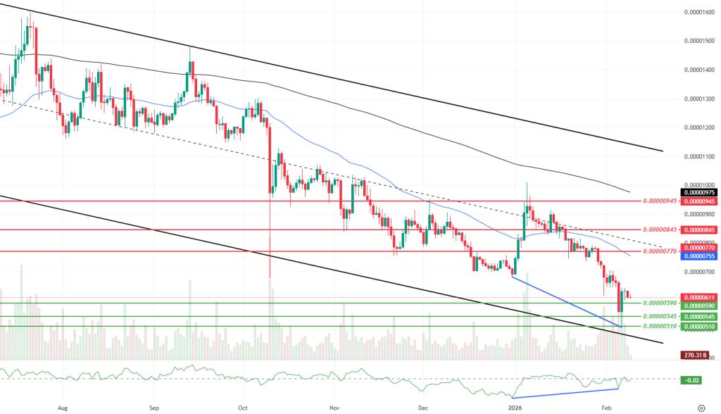 This week’s technical outlook shows that the main trend within the descending channel remains downward, but the nature of the selling is progressing towards a phase closer to exhaustion. The price losing the $0.00000635 support confirms that the market has moved to a lower support band por breaking below the previous equilibrium area. Although the decline en momentum and volume remains limited, increased volatility indicates that the decline is occurring with sharper candlestick ranges and rapid swings, while the Chaikin Money Flow (CMF) indicator remaining en negative territory shows that net capital flows are still trending towards selling. However, the positive divergence (Blue Line) between the CMF and the price indicates that while the price is producing new downward pressure, the selling flow is not strengthening to the same extent, suggesting that the downward momentum has the potential to weaken.